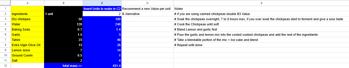 There couldnt be a better place to finally start sharing all my recipies, All my reciepies are designed on a shared google sheet with protected ranges , you are able to recommend new values, or create other versions on a different page. This is a a public google sheet recipe for hummus. Feel free to adjust, reshare ah and every recipie is designed for 1 unit as in 1 portion 200 grams this time, There is no reason for it being a 200 grams other than You Labeling as a 1 person portion. It is good to know your ingredient per portion it helps with production and costing Enjoy